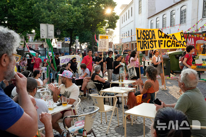 [리스본=AP/뉴시스] 15일(현지 시간) 포르투갈 리스본에서 '주거 지역 관광화(투어리스티피케케이션) 반대' 문구가 적힌 현수막을 든 시위대가 행진하는 가운데 한 술집 테라스에 있던 관광객들이 이를 지켜보며 일부는 박수하고 있다. 2025.06.16.