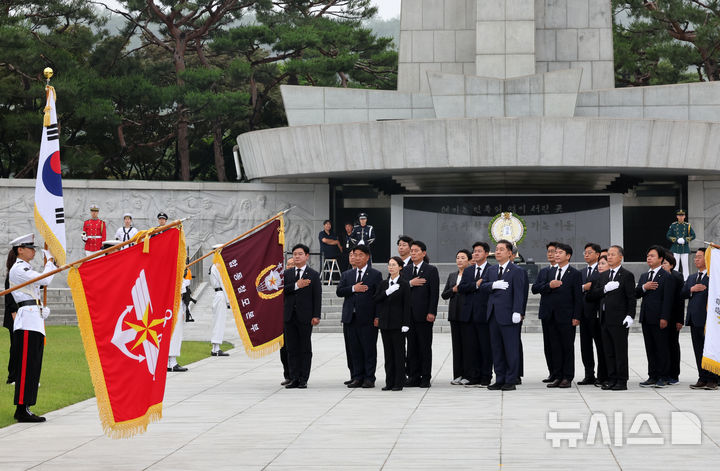 [서울=뉴시스] 배훈식 기자 = 김병기 더불어민주당 당 대표 직무대행 겸 원내대표가 16일 오전 서울 동작구 국립서울현충원을 찾아 충혼탑에 참배한 뒤 국기에 대한 경례를 하고 있다. 2025.06.16. [email protected]