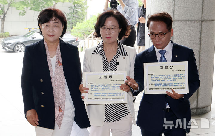 [서울=뉴시스] 조성우 기자 = 추미애(가운데) 더불어민주당 내란진상조사단 단장과 박선원(오른쪽) 간사, 서영교 의원이 16일 오전 서울 서초구 대검찰청 민원실에 김용현 전 국방부 장관과 여인형 전 국군방첩사령관, 이진우 전 육군 수도방위사령관, 노상원 전 국군정보사령관, 문상호 전 국군정보사령관 등을 내란예비음모 등 중대 범죄 혐의에 대한 고발장을 제출하기 위해 이동하고 있다. 2025.06.16. [email protected]
