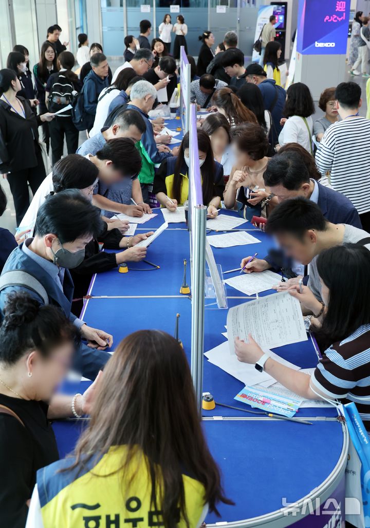 [부산=뉴시스] 하경민 기자 = '2025년 해운대구 일자리박람회'가 열린 16일 부산 해운대구 벡스코 컨벤션홀에서 구직자들이 참가신청서 및 이력서를 작성하고 있다.