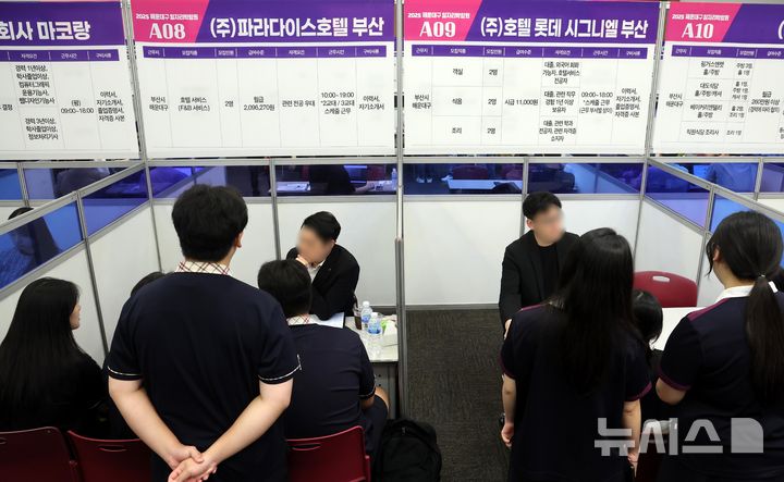[부산=뉴시스] 하경민 기자 = '2025년 해운대구 일자리박람회'가 열린 16일 부산 해운대구 벡스코 컨벤션홀에서 구직자들이 구인업체 현장면접을 보고 있다.
