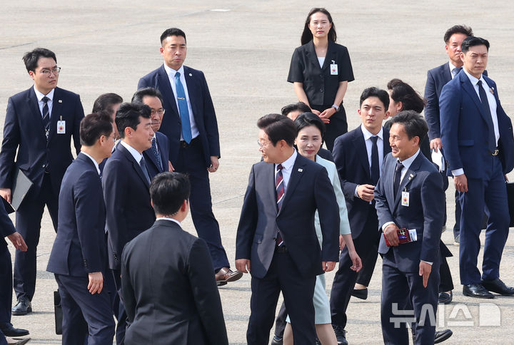 [성남=뉴시스] 최진석 기자 = 주요 7개국(G7) 정상회의 참석차 캐나다를 방문하는 이재명 대통령과 부인 김혜경 여사가 16일 성남 서울공항에서 환송 인사들과 인사하고 있다. 2025.06.16. [email protected]