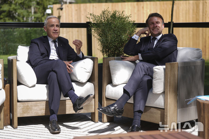 [카나나스키스=AP/뉴시스] 마크 카니(왼쪽) 캐나다 총리와 에마뉘엘 마크롱 프랑스 대통령이 16일(현지 시간) 캐나다 앨버타주 카나나스키스에서 열린 주요 7개국(G7) 정상회의에 참석해 환담하고 있다. 2025.06.16.