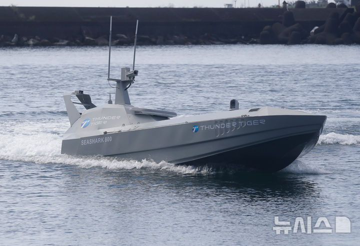 [쑤아오=AP/뉴시스] 17일(현지 시간) 대만 이란현 쑤아오에서 대만 국방부가 최신 해군 기술을 선보인 가운데 무인수상정(USV) '씨샤크 800'이 시험 운항하고 있다. 2025.06.17.