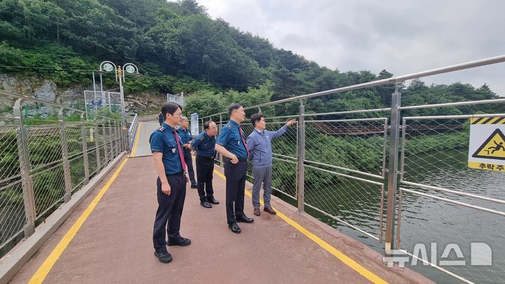 [청주=뉴시스] 김학관(오른쪽 두 번째) 충북경찰청장이 17일 괴산군 칠성면 괴산댐을 찾아 여름철 자연재난 대비태세를 살피고 있다. (사진=충북경찰청 제공) 2025.06.17. [email protected]