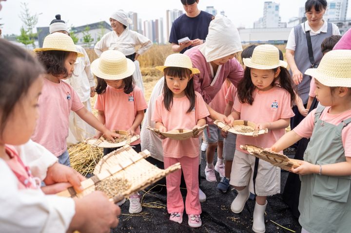 [증평=뉴시스] 서주영 기자 = 17일 충북 증평군 증평읍의 송산초등학교 부지에서 보리타작 체험 행사가 진행되고 있다. 이날 이재영 군수를 비롯해 지역 어린이, 주민 100여명이 참여했다. (사진= 증평군 제공) 2025.06.17. [email protected]