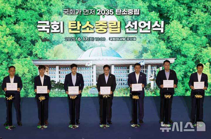[서울=뉴시스] 김명년 기자 = 우원식 국회의장(가운데)과 김병기(오른쪽 세번째) 더불어민주당 대표 직무대행 겸 원내대표, 김용태(왼쪽 세번째) 국민의힘 비상대책위원장 등 참석자들이 17일 오전 서울 여의도 국회에서 열린 탄소중립 선언식에서 탄소중립 비전 퍼포먼스를 하고 있다. 2025.06.17. [email protected]