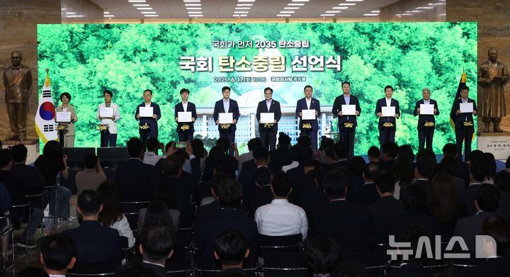 [서울=뉴시스] 조성봉 기자 = 우원식 국회의장과 여야 대표들이 17일 오전 서울 여의도 국회 로텐더홀에서 열린 국회 탄소중립 선언식에서 탄소중립 비전 퍼포먼스를 하고 있다. 왼쪽부터 한정애 국회 기후위기 특별위원장, 윤종오 진보당 원내대표, 주호영 국회부의장, 한창민 사회민주당 대표, 김용태 국민의힘 비상대책위원장, 우원식 국회의장, 김병기 더불어민주당 대표 직무대행 겸 원내대표, 천하람 개혁신당 원내대표, 이학영 국회부의장, 서왕진 조국혁신당 원내대표, 안호영 국회 환경노동위원회 위원장. 2025.06.17. [email protected]