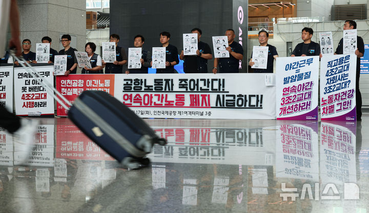 [인천공항=뉴시스] 권창회 기자 = 민주노총 공공운수노조 소속 조합원들이 17일 인천 중구 인천국제공항 제1터미널 출국장 인근에서 열린 인천공항 야간노동 현실폭로 기자회견에서 손피켓을 들고 있다. 2025.06.17. [email protected]