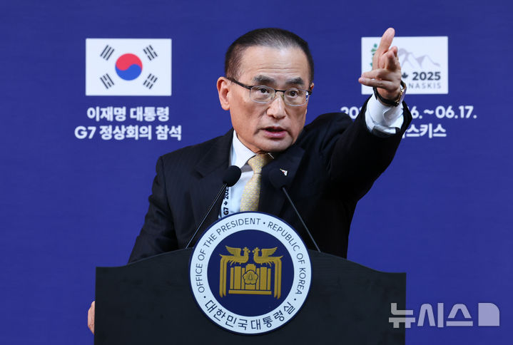 [캘거리=뉴시스] 최진석 기자 = 위성락 국가안보실장이 16일(현지 시간) 캘거리 한 호텔에 차려진 프레스센터 내 중앙기자실에서 이재명 대통령의 주요 7개국(G7) 정상회의 참석 관련 브리핑을 하고 있다. 2025.06.17. [email protected]