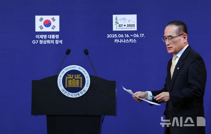 [캘거리=뉴시스] 최진석 기자 = 위성락 국가안보실장이 16일(현지 시간) 캘거리 한 호텔에 차려진 프레스센터 내 중앙기자실에 이재명 대통령의 주요 7개국(G7) 정상회의 참석 관련 브리핑을 위해 입장하고 있다. 2025.06.17. [email protected]