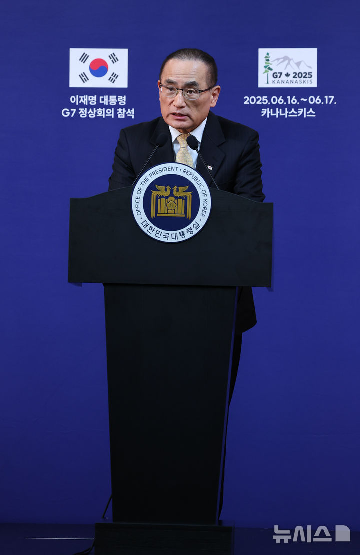 [캘거리=뉴시스] 최진석 기자 = 위성락 국가안보실장이 16일(현지 시간) 캘거리 한 호텔에 차려진 프레스센터 내 중앙기자실에서 이재명 대통령의 주요 7개국(G7) 정상회의 참석 관련 브리핑을 하고 있다. 2025.06.17. [email protected]