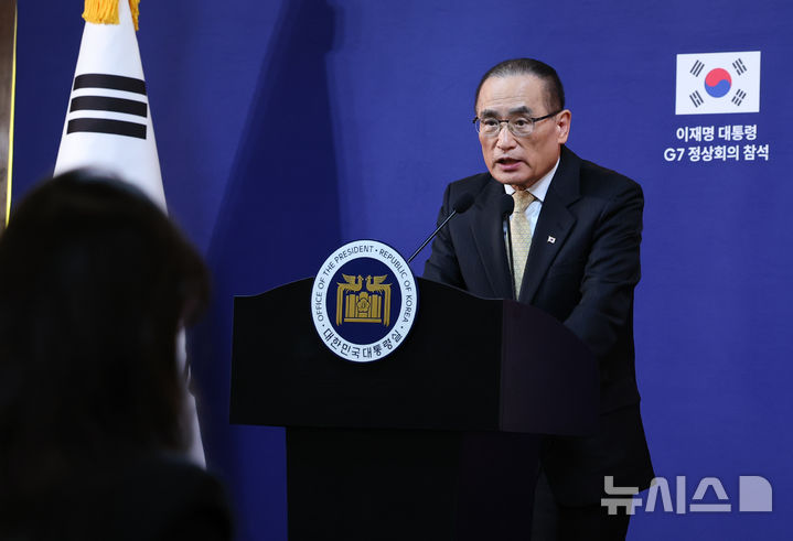 [캘거리=뉴시스] 최진석 기자 = 위성락 국가안보실장이 16일(현지 시간) 캘거리 한 호텔에 차려진 프레스센터 내 중앙기자실에서 이재명 대통령의 주요 7개국(G7) 정상회의 참석 관련 브리핑을 하고 있다. 2025.06.17. [email protected]