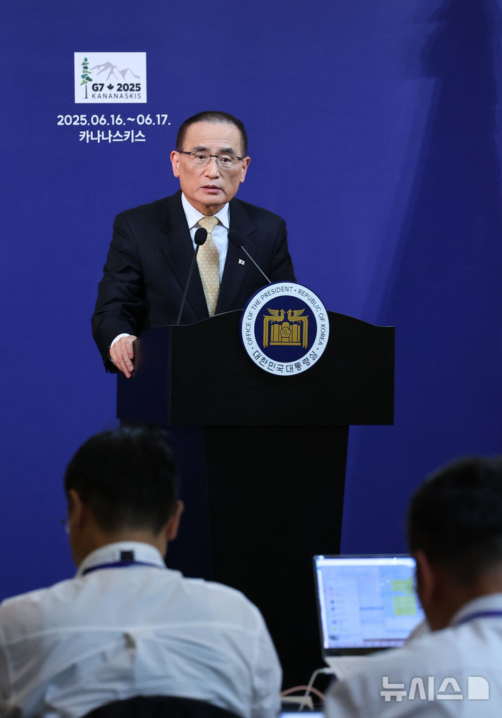 [캘거리=뉴시스] 최진석 기자 = 위성락 국가안보실장이 16일(현지 시간) 캘거리 한 호텔에 차려진 프레스센터 내 중앙기자실에서 이재명 대통령의 주요 7개국(G7) 정상회의 참석 관련 브리핑을 하고 있다. 2025.06.17. [email protected]