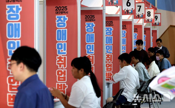 [대구=뉴시스] 이무열 기자 = 17일 대구 달서구 대구직업능력개발원 실내체육관에서 열린 ‘2025 대구 장애인 취업박람회’에서 구직자들이 현장면접을 보고 있다. 2025.06.17. [email protected]