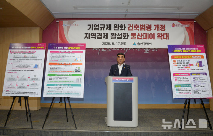 [울산=뉴시스] 배병수 기자 = 김두겸 울산시장이 17일 오후 시청 프레스센터에서 기자회견을 열고 기업규제 완화 건축법령 개정 및 지역경제 활성화 울산페이 확대계획을 설명하고 있다. [email protected].