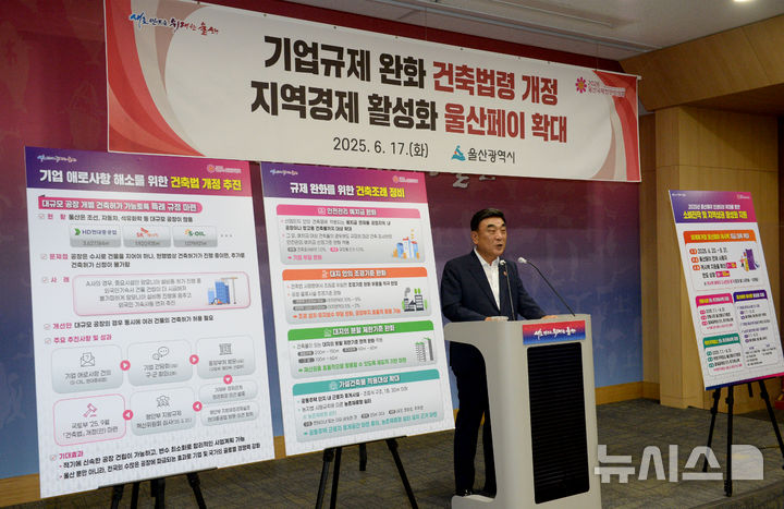[울산=뉴시스] 배병수 기자 = 김두겸 울산시장이 17일 오후 시청 프레스센터에서 기자회견을 열고 기업규제 완화 건축법령 개정 및 지역경제 활성화 울산페이 확대계획을 설명하고 있다. [email protected].