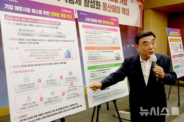 [울산=뉴시스] 배병수 기자 = 김두겸 울산시장이 17일 오후 시청 프레스센터에서 기자회견을 열고 기업규제 완화 건축법령 개정 및 지역경제 활성화 울산페이 확대계획을 설명하고 있다. [email protected].