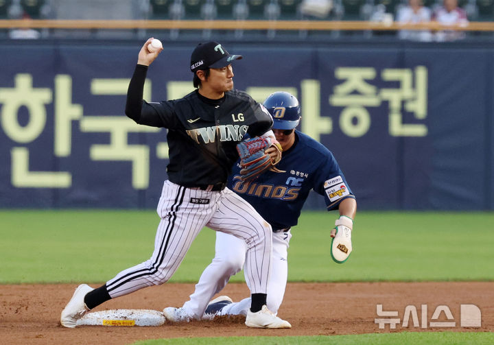 [서울=뉴시스] 배훈식 기자 = 17일 오후 서울 송파구 잠실야구장에서 열린 2025 신한 쏠뱅크 KBO리그 LG 트윈스와 NC 다이노스의 경기, 3회초 무사 1, 2루 상황에서 LG 신민재가 병살 플레이를 완성하는 송구를 하고 있다. 2025.06.17. [email protected]