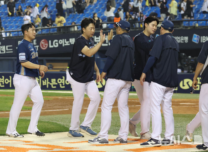 [서울=뉴시스] 배훈식 기자 = 17일 오후 서울 송파구 잠실야구장에서 열린 2025 신한 쏠뱅크 KBO리그 LG 트윈스와 NC 다이노스의 경기, 6대 2로 승리한 NC 선수들이 하이파이브를 하고 있다. 2025.06.17. [email protected]