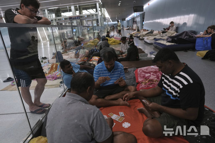 [라마트간=AP/뉴시스] 17일(현지 시간) 이스라엘 텔아비브 인근 라마트간에서 시민들이 이란의 미사일 공격에 대비해 지하철역에 대피해 카드놀이를 하며 시간을 보내고 있다. 2025.06.18.