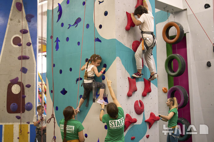 [부쿠레슈티=AP/뉴시스] 17일(현지 시간) 루마니아 부쿠레슈티에서 비정부기구(NGO) '클라임 어게인'이 주최한 장애 아동 대상 스포츠 치료 행사에서 자원봉사자들이 어린이들의 암벽 등반을 돕고 있다. 2025.06.18.
