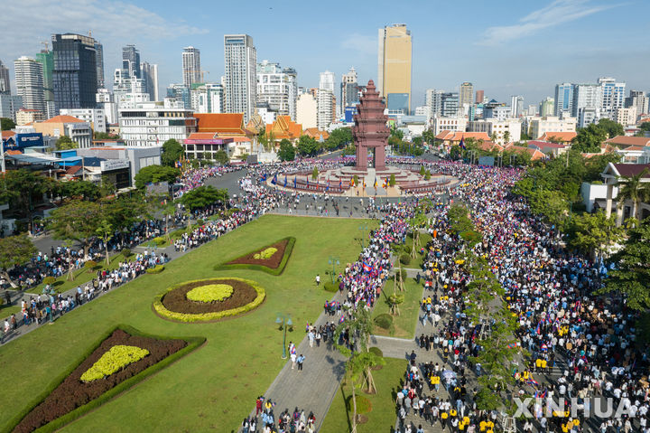 [프놈펜=신화/뉴시스] 18일(현지 시간) 캄보디아 프놈펜에서 시민들이 '연대 행진'에 참여하고 있다. 캄보디아는 최근 태국과의 국경 분쟁으로 갈등이 해소되지 않으면서 수만 명의 캄보디아인이 행진에 나서 국민의 단결을 촉구하고 정부에 대해 지지를 표명했다. 2025.06.18.