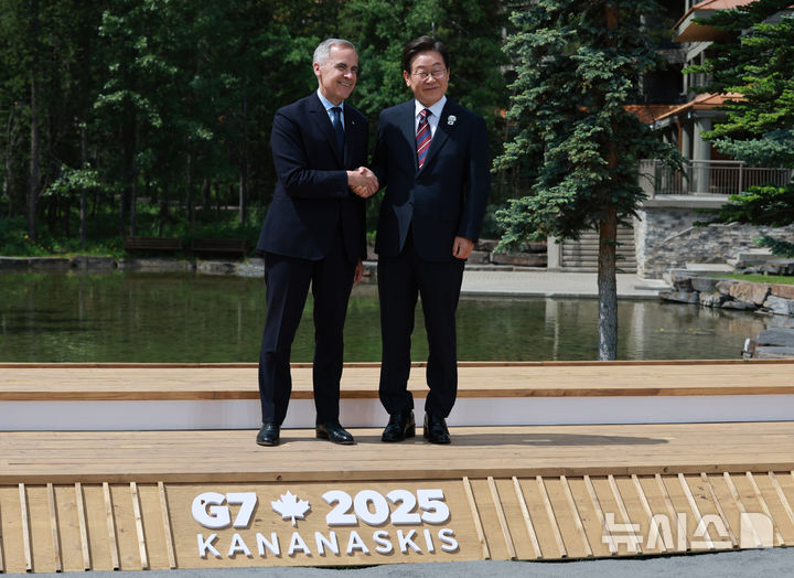 [카나나스키스(캐나다)=뉴시스] 최진석 기자 = 이재명 대통령이 17일(현지 시간) 캐나다 앨버타주 카나나스키스 주요 7개국(G7) 정상회의장에서 열린 초청국 공식 환영식에 도착해 의장국 마크 카니 캐나다 총리와 악수하고 있다. 2025.06.18. [email protected]