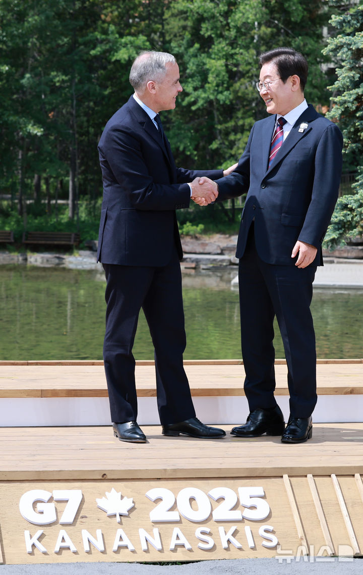 [카나나스키스(캐나다)=뉴시스] 최진석 기자 = 이재명 대통령이 17일(현지 시간) 캐나다 앨버타주 카나나스키스 주요 7개국(G7) 정상회의장에서 열린 초청국 공식 환영식에 도착해 의장국 마크 카니 캐나다 총리와 악수하고 있다. 2025.06.18. [email protected]