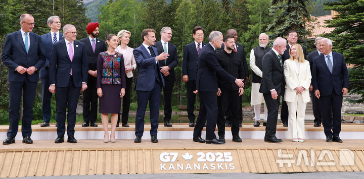 [카나나스키스(캐나다)=뉴시스] 최진석 기자 = 이재명 대통령이 17일(현지시간) 캐나다 앨버타주 카나나스키스 주요 7개국(G7) 정상회의장에서 의장국 마크 카니 캐나다 총리, 초청국 정상들과 함께 기념촬영을 준비하고 있다. 2025.06.18. [email protected]