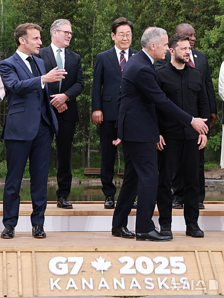 [카나나스키스(캐나다)=뉴시스] 최진석 기자 = 이재명 대통령이 17일(현지시간) 캐나다 앨버타주 카나나스키스 주요 7개국(G7) 정상회의장에서 의장국 마크 카니 캐나다 총리, 초청국 정상들과 함께 기념촬영을 준비하고 있다.  2025.06.18. [email protected]