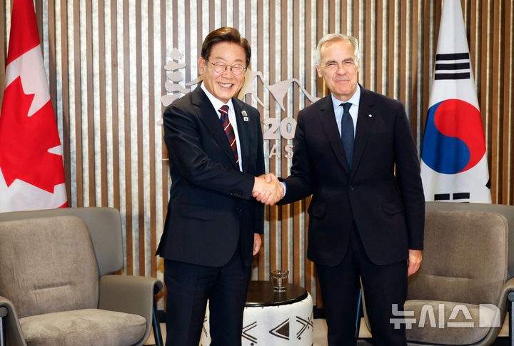 [카나나스키스(캐나다)=뉴시스] 최진석 기자 = 이재명 대통령이 17일(현지 시간) 캐나다 앨버타주 카나나스키스 주요 7개국(G7) 정상회의장에서 열린 한-캐나다 정상회담에서 마크 카니 캐나다 총리와 악수하며 기념촬영을 하고 있다. 2025.06.18. [email protected]