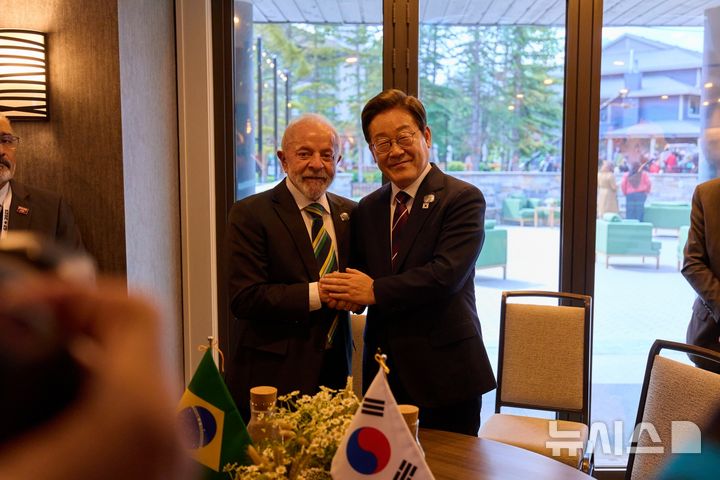 [카나나스키스(캐나다)=뉴시스] 최진석 기자 = 이재명 대통령이 17일(현지 시간) 캐나다 앨버타주 카나나스키스 주요 7개국(G7) 정상회의장에서 루이스 이나시우 룰라 다 시우바 브라질 대통령과 한-브라질 정상회담에 기념촬영하고 있다. (공동취재) 2025.06.18. [email protected]