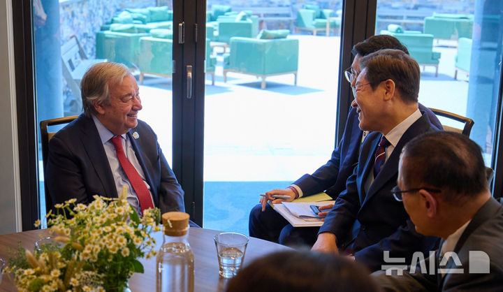 [카나나스키스(캐나다)=뉴시스] 최진석 기자 = 이재명 대통령이 17일(현지 시간) 캐나다 앨버타주 카나나스키스 주요 7개국(G7) 정상회의장에서 안토니우 구테레쉬 유엔(UN) 사무총장과 약식회동을 하고 있다. (공동취재) 2025.06.18. [email protected]