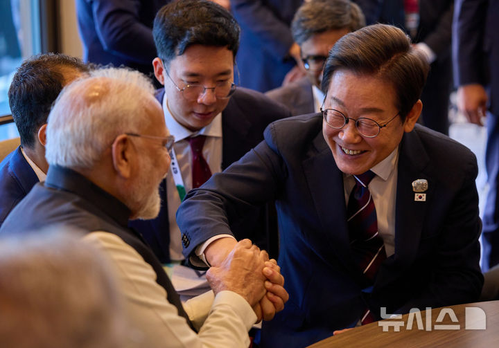 [카나나스키스(캐나다)=뉴시스] 최진석 기자 = 이재명 대통령이 17일(현지 시간) 캐나다 앨버타주 카나나스키스 주요 7개국(G7) 정상회의장에서 나렌드라 모디 인도 총리와 한-인도 정상회담을 하고 있다. (공동취재) 2025.06.18. [email protected]