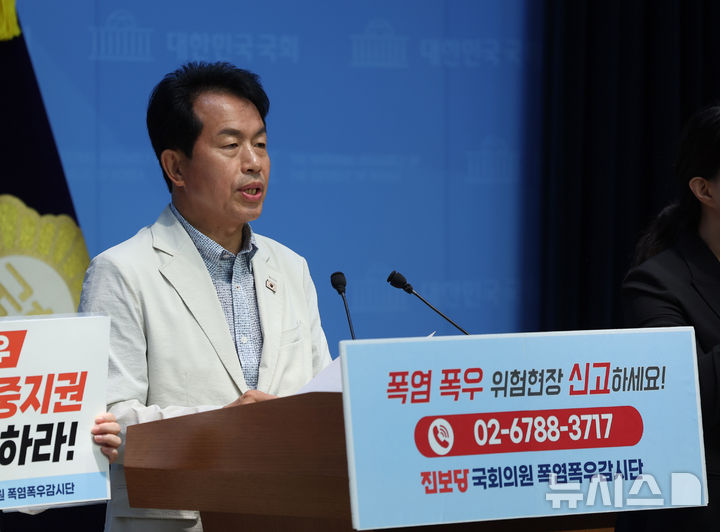 [서울=뉴시스] 김명년 기자 = 윤종오 진보당 원내대표가 18일 오전 서울 여의도 국회 소통관에서 '진보당 국회의원단 폭염폭우감시단' 기자회견을 열고 발언하고 있다. 2025.06.18. [email protected]
