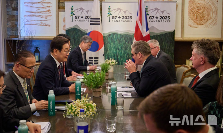 [카나나스키스(캐나다)=뉴시스] 최진석 기자 = 이재명 대통령이 17일(현지 시간) 캐나다 앨버타주 카나나스키스 주요 7개국(G7) 정상회의장에서 키어 스타머 영국 총리와 한-영 정상회담을 하고 있다. (공동취재) 2025.06.18. [email protected]