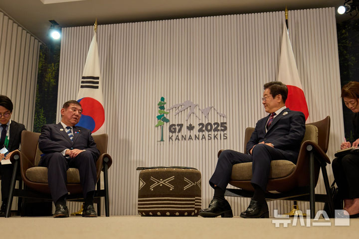 [카나나스키스(캐나다)=뉴시스] 최진석 기자 = 이재명 대통령이 17일(현지 시간) 캐나다 앨버타주 캐내내스키스 주요 7개국(G7) 정상회의장에서 이시바 시게루 일본 총리와 한일 정상회담을 하고 있다. (공동취재) 2025.06.18. [email protected]