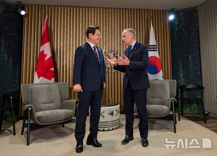 [카나나스키스(캐나다)=뉴시스] 최진석 기자 = 이재명 대통령이 17일(현지 시간) 캐나다 앨버타주 캐내내스키스 주요 7개국(G7) 정상회의장에서 마크 카니 캐나다 총리와 한-캐나다 정상회담을 하기 전 대화하고 있다. (공동취재) 2025.06.18. [email protected]