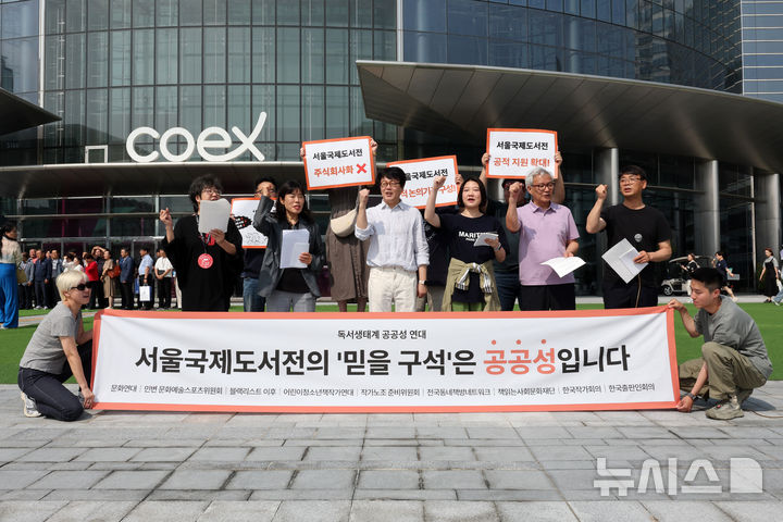 [서울=뉴시스] 박진희 기자 = '2025 서울국제도서전' 개막식이 열린 18일 서울 강남구 코엑스 앞에서 한국출판인회의, 한국작가회의 등 출판·문학 관련 단체들이 모인 독서생태계 공공성 연대 회원들이 기자회견을 열고 "서울국제도서전의 주식회사화, 사유화, 영리화에 반대한다"는 성명을 발표하고 있다. 2025.06.18. [email protected]