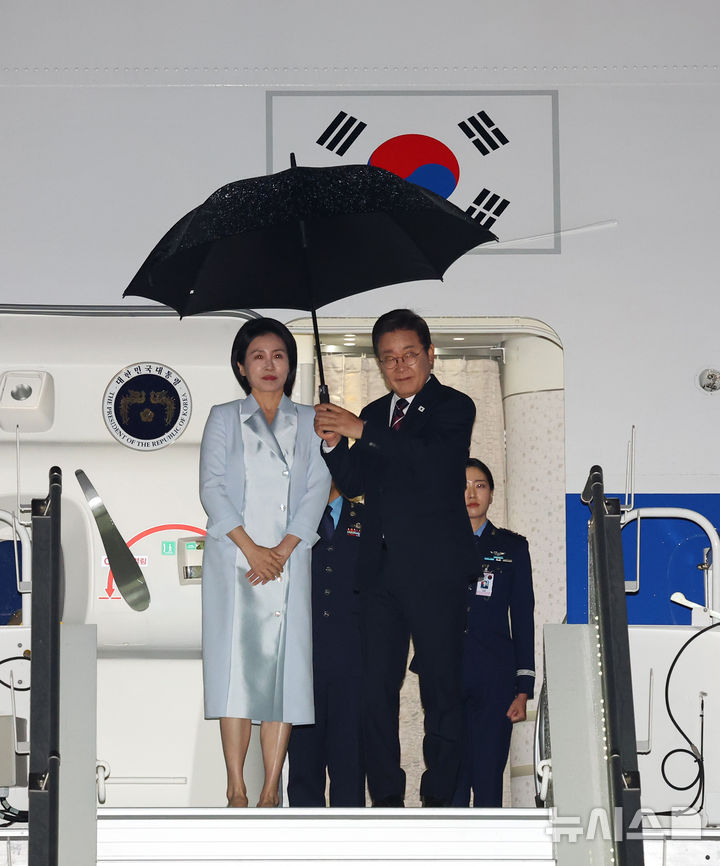 [캘거리=뉴시스] 최진석 기자 = 주요 7개국(G7) 정상회의 참석을 마친 이재명 대통령과 부인 김혜경 여사가 17일(현지 시간) 캐나다 앨버타주 캘거리국제공항에 도착해 공군 1호기에 탑승하고 있다. 2025.06.18. [email protected]