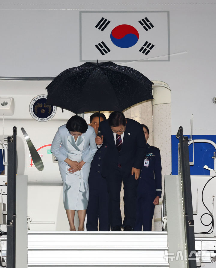 [캘거리=뉴시스] 최진석 기자 = 주요 7개국(G7) 정상회의 참석을 마친 이재명 대통령과 부인 김혜경 여사가 17일(현지 시간) 캐나다 앨버타주 캘거리국제공항에 도착해 공군 1호기에 탑승하며 인사하고 있다. 2025.06.18. [email protected]