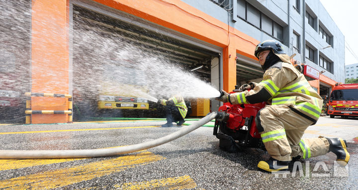 [인천=뉴시스] 전진환 기자 = 18일 오후 인천 부평구 부평소방서에서 소방관들이 다가올 장마를 앞두고 침수 사고 등에 대비해 동력펌프 등 장비를 점검하고 있다. 2025.06.18. [email protected]