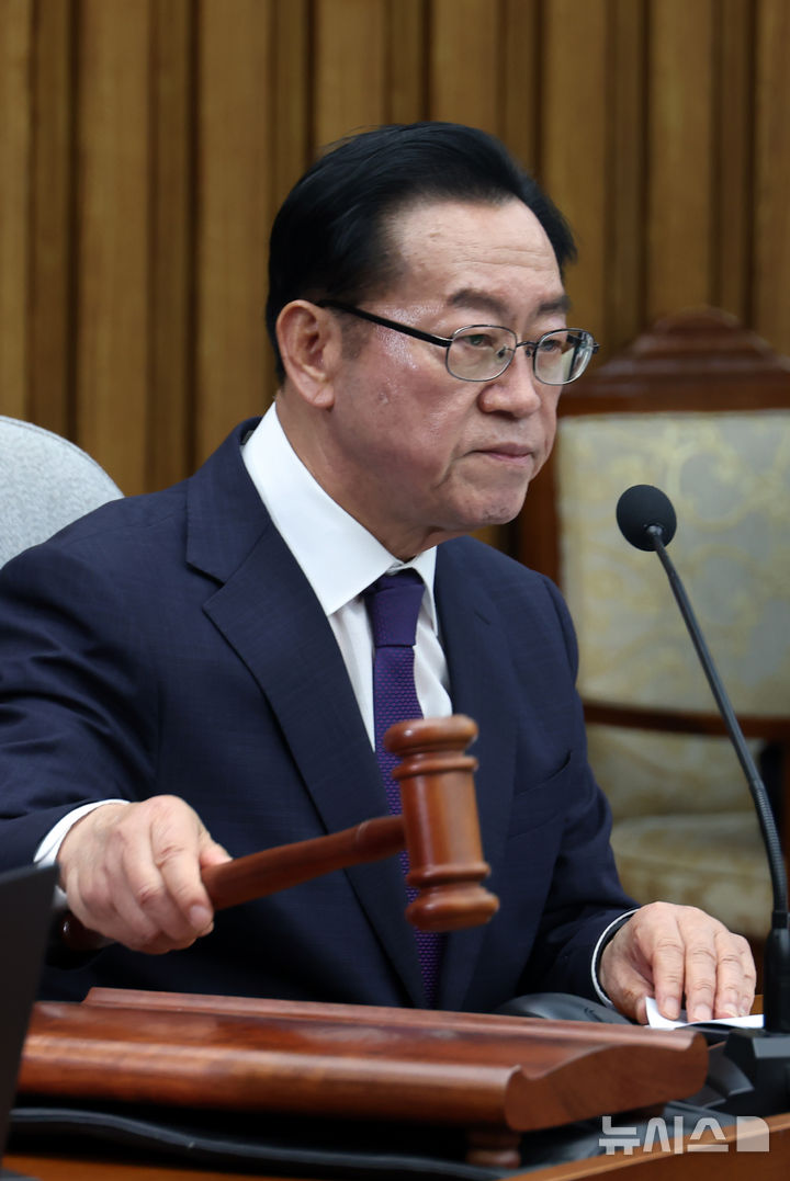 [서울=뉴시스] 고승민 기자 = 18일 서울 여의도 국회에서 열린 정무위원회의 국무총리(김민석) 임명동의에 관한 인사청문특별위원회 제1차 전체회의에서 이종배 특위 위원장이 의사봉을 두드리고 있다. 2025.06.18. [email protected]