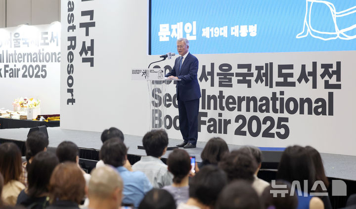 [서울=뉴시스] 김선웅 기자 = 문재인 전 대통령이 18일 서울 강남구 코엑스에서 열린 2025 서울국제도서전, 한국에서 가장 좋은 책 시상식에 참석해 축사를 하고 있다. 2025.06.18. [email protected]