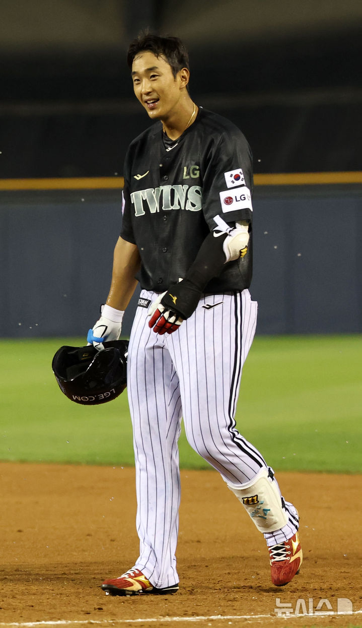 [서울=뉴시스] 김선웅 기자 = 18일 서울 송파구 잠실야구장에서 열린 2025 프로야구 NC 다이노스와 LG 트윈스의 경기, 9회말 1사 주자 1,3루 8-8 동점 상황, LG 2번타자 송찬의가 1타점 끝내기 안타로 경기를 9-8로 마무리하며 밝은 표정을 하고 있다. 2025.06.18. [email protected]