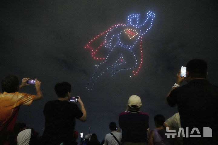 [파시그=AP/뉴시스] 18일(현지 시간) 필리핀 파시그에서 시민들이 드론으로 연출된 '슈퍼맨' 형상을 휴대전화로 찍고 있다. 이번 행사는 영화 '슈퍼맨 2025'이 필리핀에서 최초 공개되는 것을 앞두고 진행됐다. 2025.06.19.