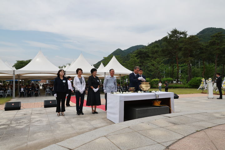 [영동=뉴시스] 19일 충북 영동군 황간면 노근리평화공원에서 75주기 노근리사건 희생자 합동추모식이 거행되고 있다. 이날 영동군은 '노근리 민간인 희생 사건'의 희생자 191위를 모시는 위패 봉안관을 준공했다. (사진=영동군 제공) 2025.06.19. [email protected]