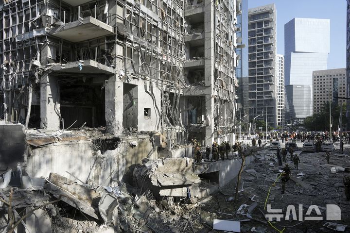 [라마트간=AP/뉴시스] 19일(현지 시간) 이스라엘 텔아비브 인근 라마트간에서 구조대와 군 관계자들이 이란의 미사일 직격 현장을 살피고 있다. 2025.06.20.