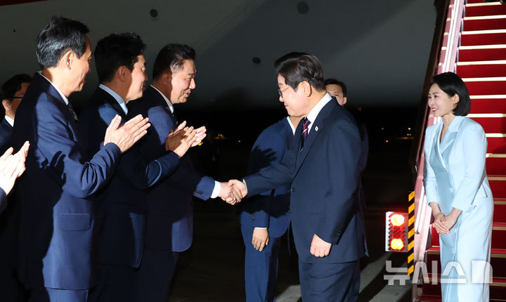 [성남=뉴시스] 최진석 기자 = 이재명 대통령과 부인 김혜경 여사가 19일 주요 7개국(G7) 정상회의 참석을 마치고 성남 서울공항에 도착해 공군 1호기 내려 김병기 더불어민주당 당대표 직무대행 겸 원내대표와 악수하고 있다. 2025.06.19. [email protected]